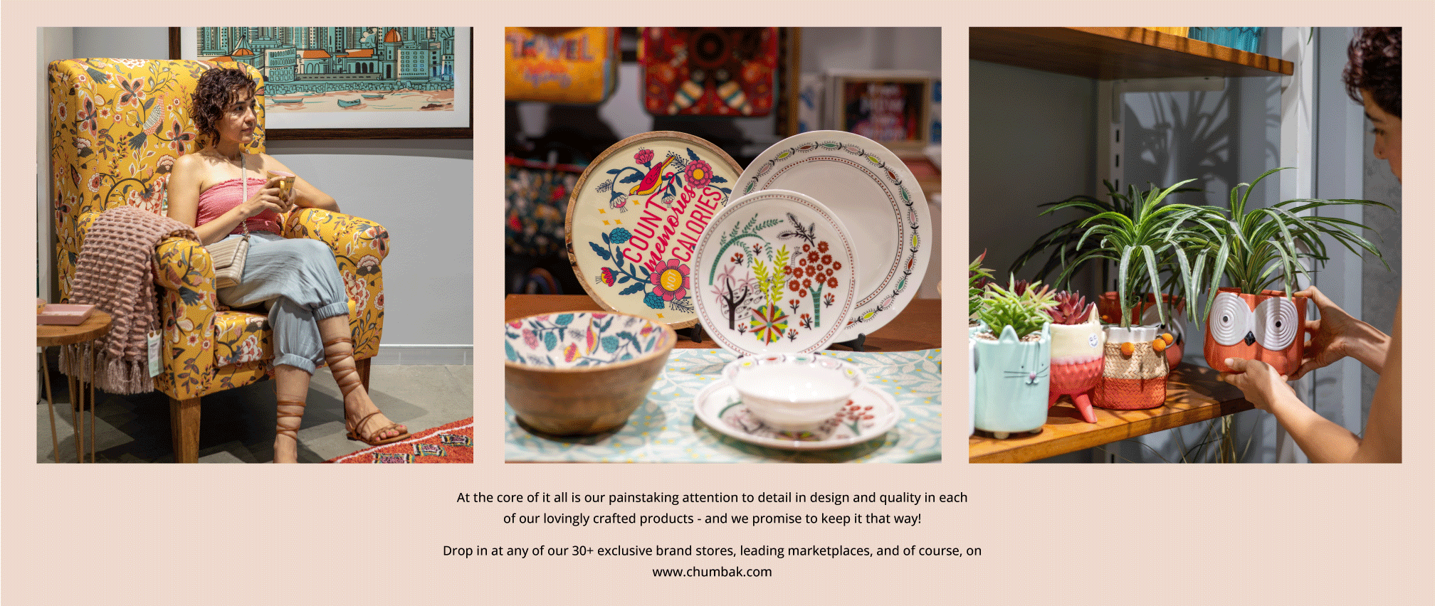 aesthetic that celebrates Indian Design, created for a modern – global lifestyle. Everything we create at Chumbak is true to our 6 brand pillars of Wit, Warmth, Honesty, Creativity, Spontaneity & Community.