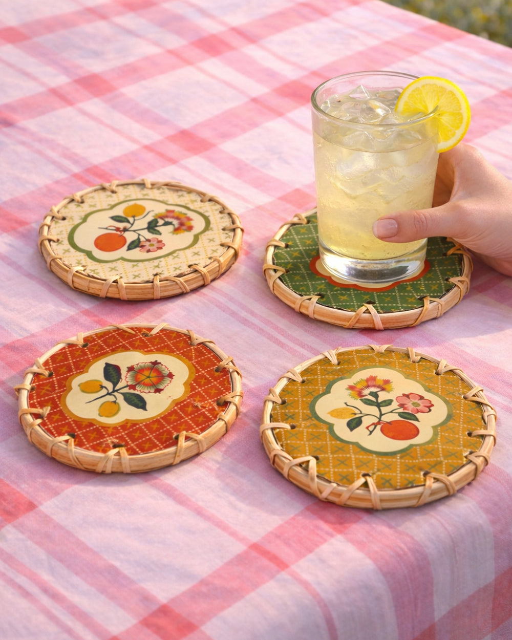 Fresh, citrusy, handwoven into Rattan - ready for summer coasters. Comes with a caddy to organise.