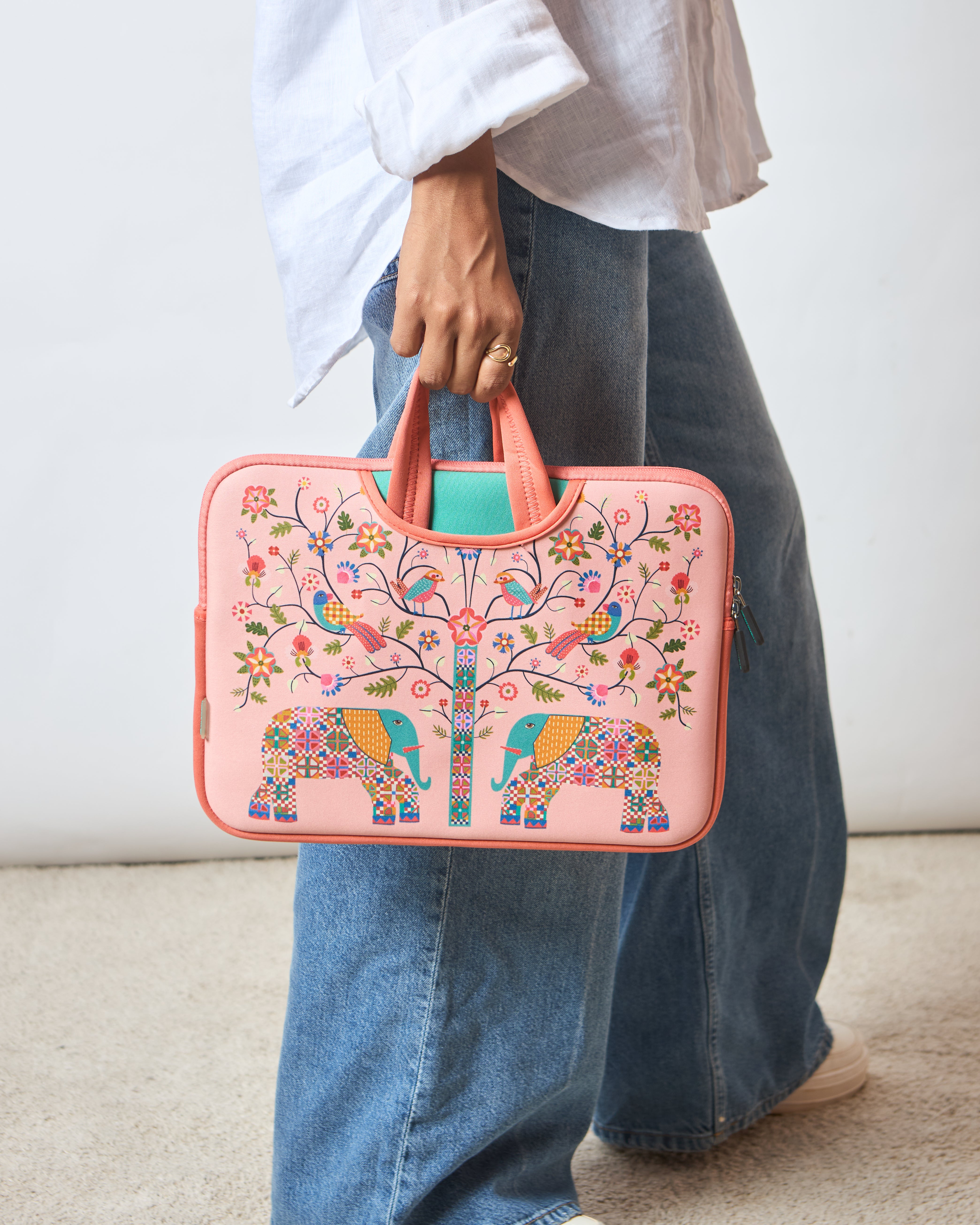 A celebration of craft and color, this sleeve brings patchwork-inspired patterns to life through vibrant elephant motifs. Blending folk artistry with modern function, it keeps your laptop safe while adding a touch of cultural charm to your everyday.